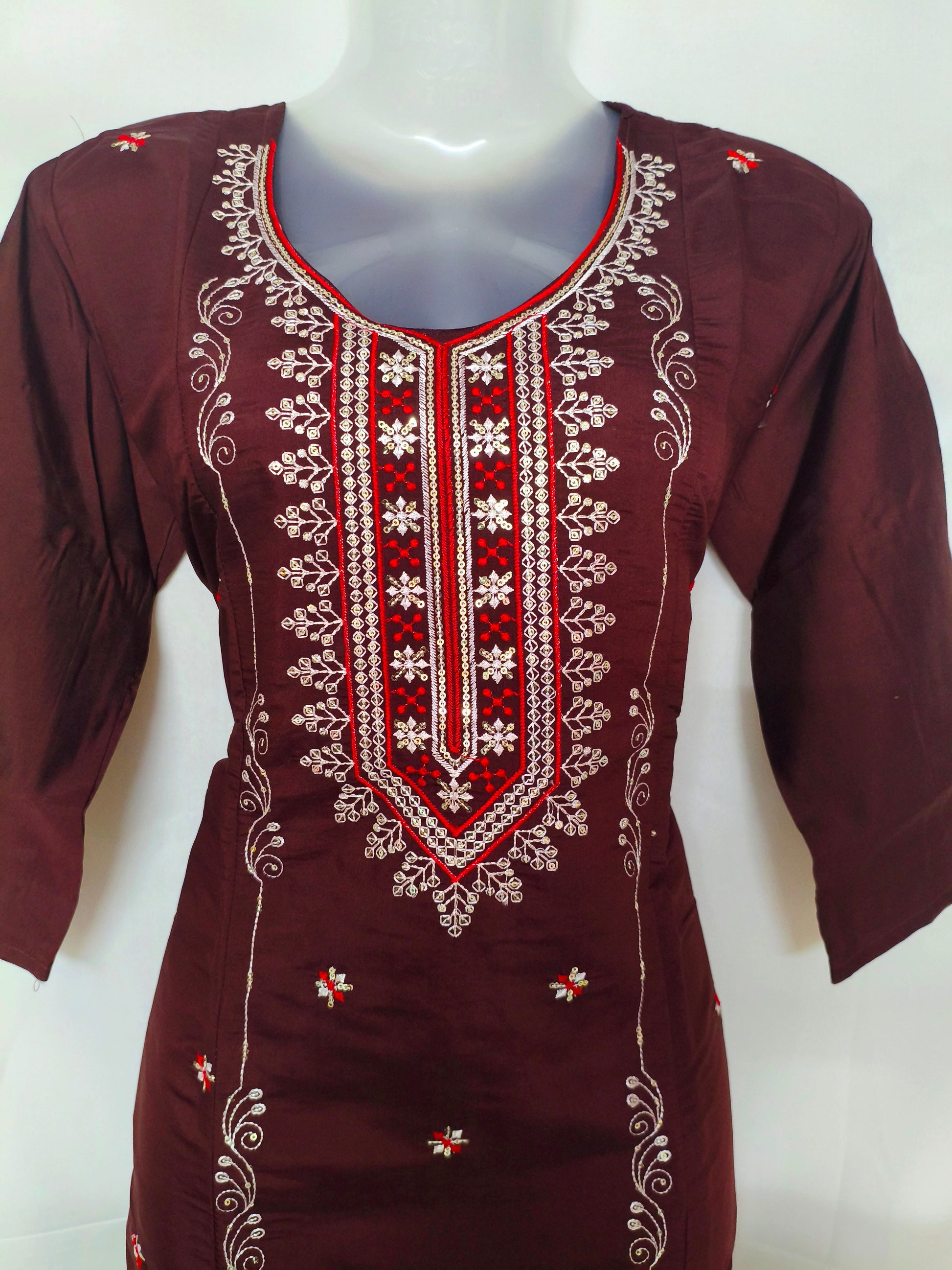 A rich maroon 3-piece kurta set featuring intricate silver and red embroidery on the neckline and body, styled with straight-fit pants and a matching embroidered net dupatta. A perfect balance of elegance and comfort, ideal for festive gatherings and traditional occasions.