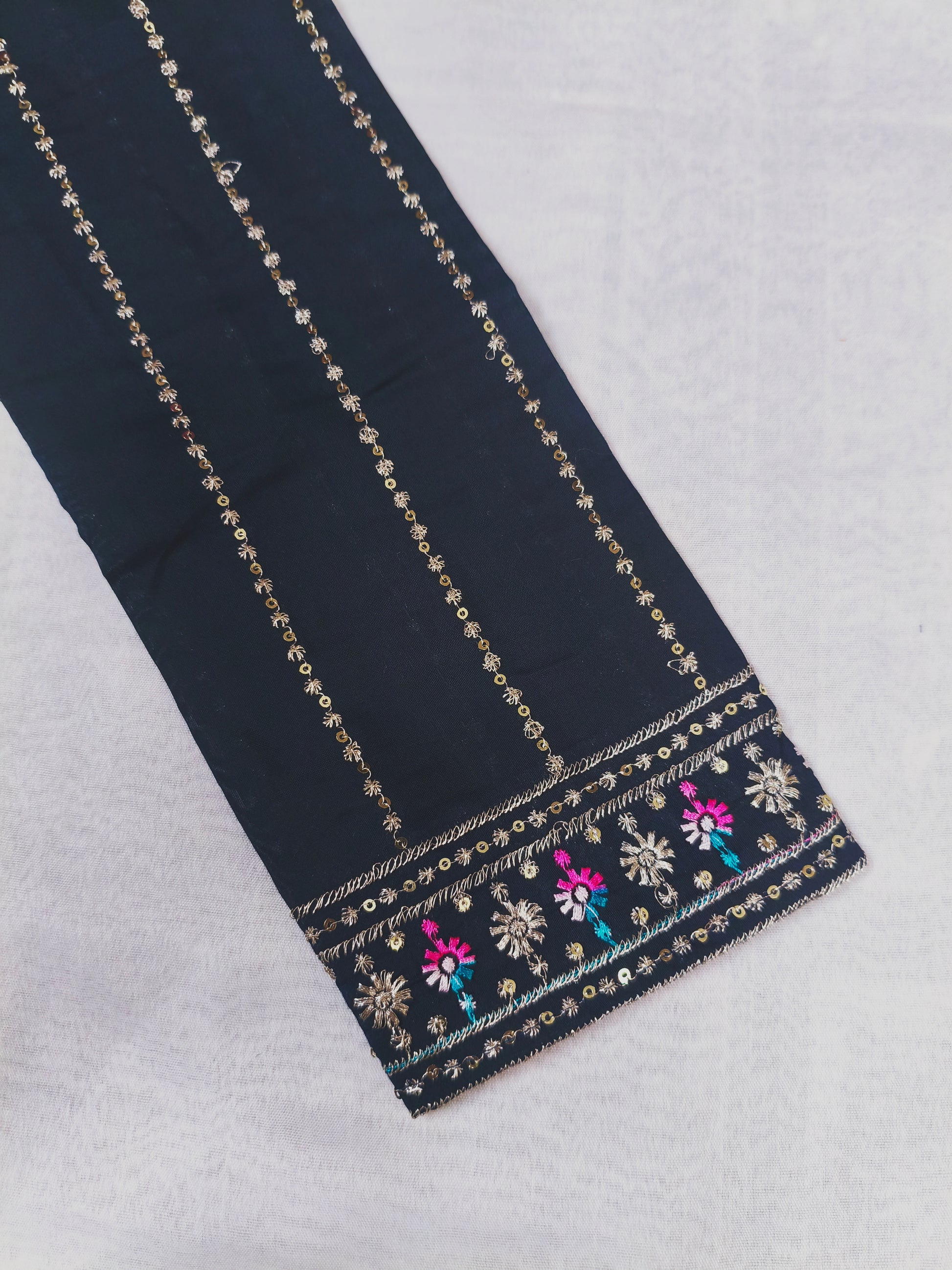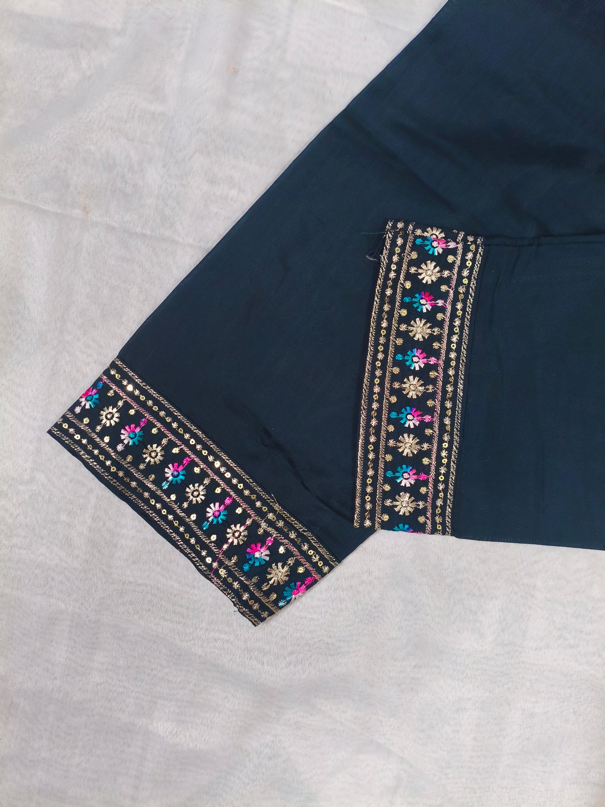 Add timeless elegance to your festive wardrobe with this navy blue silk kurta set. Designed with a V-neckline embellished with mirror and floral embroidery, paired with matching straight pants and a golden-striped dupatta, this 3-piece set is perfect for weddings and evening celebrations.